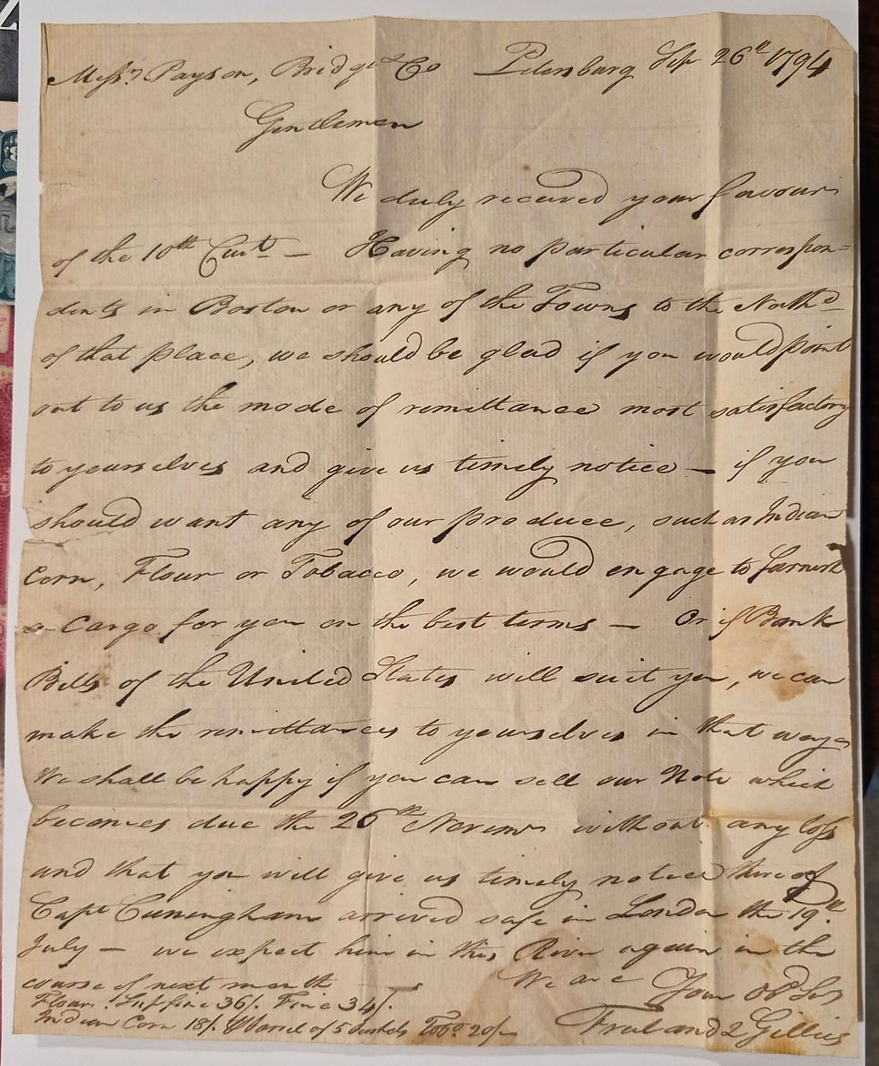 1797 Stampless folded letter from Petersburg, VA to Philadelphia